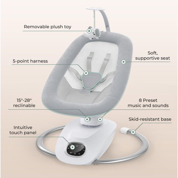 Momcozy Cocosway – modernios elektrinės supynės kūdikiams, sukurtos švelniam, natūraliam ir raminančiam supimui nuo pat gimimo. Inovatyvus 3D judėjimas (į priekį, atgal ir į šonus) primena mamos glėbį, padeda greičiau nusiraminti ir lengviau užmigti, o 5 greičiai, muzika bei nuotolinis valdymas leidžia viską prisitaikyti prie mažylio nuotaikos – be papildomo streso tėvams.