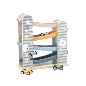 Spalvinga „PolarB“ medinė automobilių trasa pralinksmins ir mažuosius, ir tėvelius. Komplekte esantys keturi skirtingų spalvų, numeruoti mini automobiliukai rieda nuo rampos, o 4 numeruoti lizdai padeda lengvai susitvarkyti po žaidimo ir kartu mokytis skaičių bei spalvų derinimo. Žaidžiant natūraliai lavėja smulkioji motorika, akių–rankos koordinacija, loginis mąstymas ir vaizduotė. Daili pakuotė puikiai tinka dovanai.