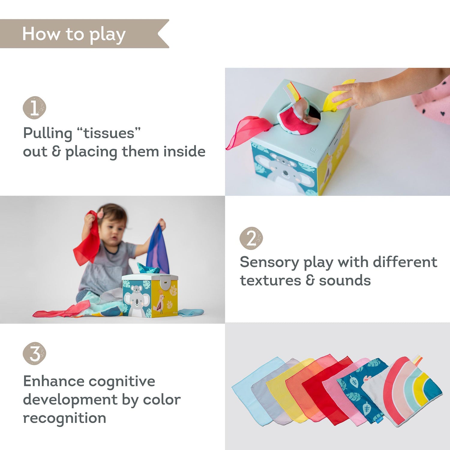 - Alates 3 kuu vanusest küljel on ere värviskeem koos 3D-illustratsioonidega intensiivseks visuaalseks stimulatsiooniks - vanemad saavad seda värvilist külge kasutada, et hoida beebi kauem kaasas ja keskenduda - eriti kasulik, kui väike uurija lamab kõhuli - see tugevdab beebi kaela- ja õlalihased. Tasku, närimine ja erinevad tekstuurid ja detailid soodustavad puudutust ja arendavad peenmotoorikat.