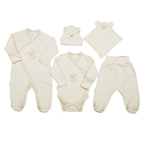 Tērps sastāv no siltas un mīkstas OEKOTEX sertificētas kokvilnas cepures, rompera, kombinezona, biksēm un guļamvietas. Iepakots skaistā kastītē - lieliski piemērots dāvināšanai vai līdzņemšanai uz dzemdību namu kā pirmo mazuļa drēbīšu komplektu.
